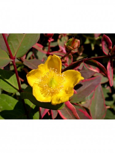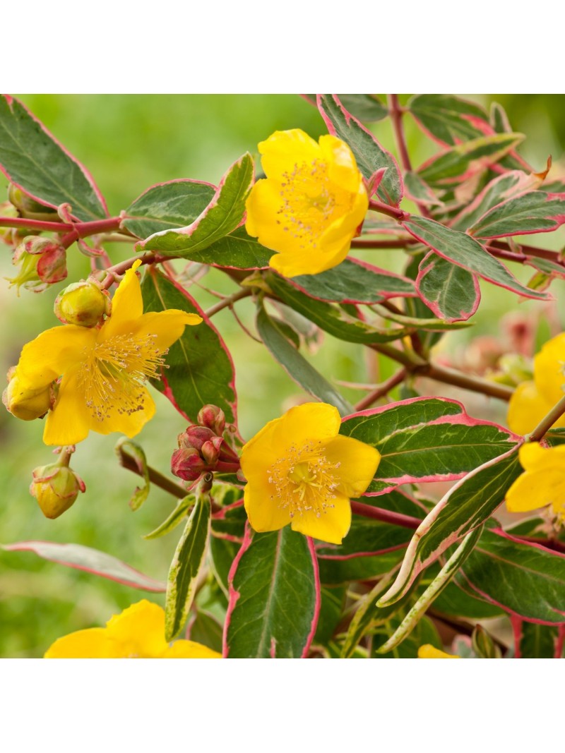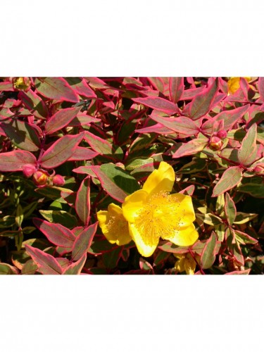 Grazioso arbusto spogliante, a portamento ricadente, l'Hypericum moserianum Tricolor si caratterizza per la bellezza del fogliame, verde-bluastro bordato di rosso-violaceo, a foglia semipersistente e di forma espansa. I fiori, che cominciano a sbocciare in estate, sono piuttosto grandi, giallo oro, a 5 petali con numerosi stami centrali. Di rapida crescita e tollerante terreni anche tenaci, richiede una buona potatura a fine inverno per rigenerare nuovi e robusti tralci fioriferi. Si usa per piccole bordure, bordi misti, aiuole, macchie, per consolidare terreni instabili, ma anche per vasi o cassette in terrazza ed è particolarmente gradito per l'abbondanza di fiori per lunghi periodi.